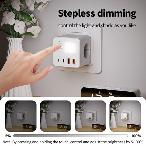 1 EU power strip, 3 AC sockets & 2 USB ports & 2 Type-C ports & with a 3-color small night light.